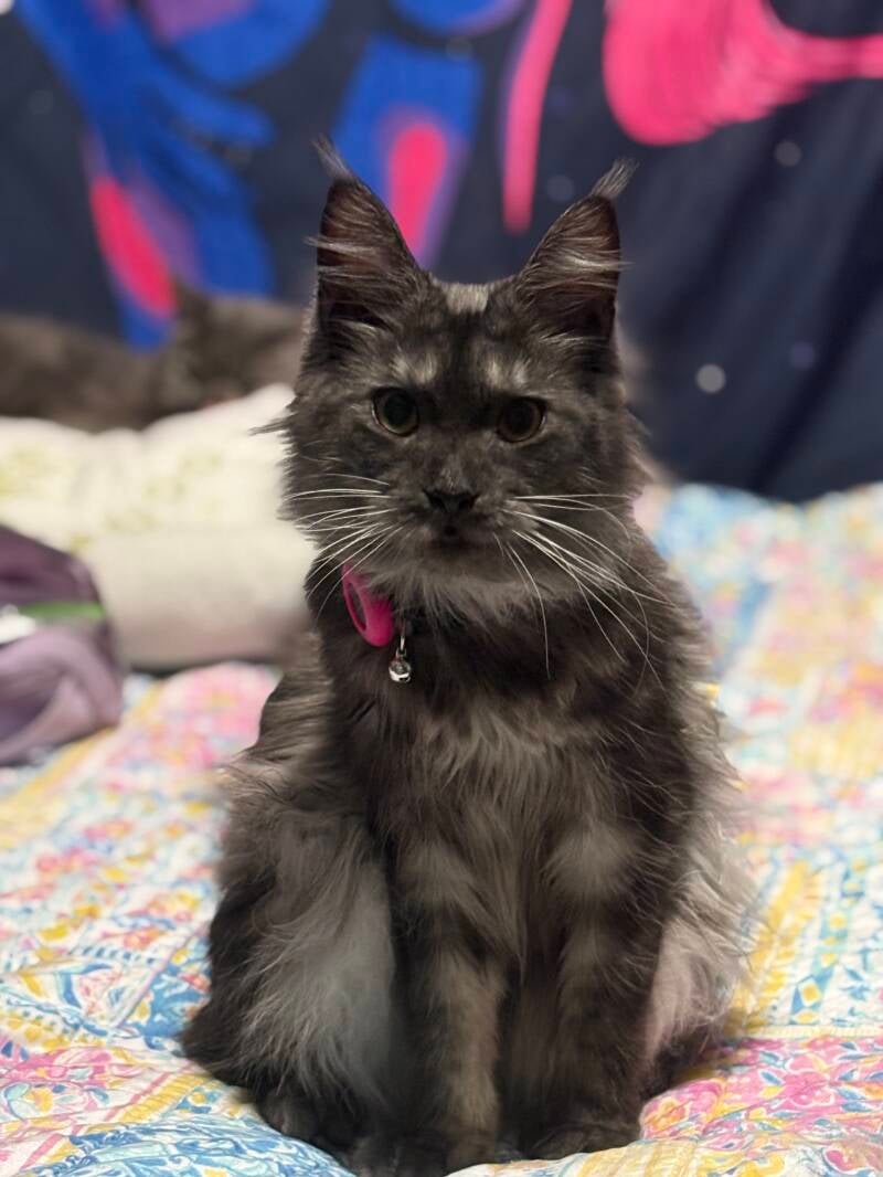 With a breathtaking smoke coat that glows like stardust in the night, Andromeda carries herself with a quiet majesty that feels both powerful and deeply comforting. She is the heart of our cattery — affectionate, loyal, and endlessly connected to the people she loves.